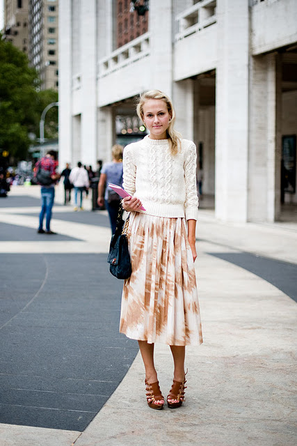 Mary Kate Steinmiller, editor at Teen Vogue, relishes in feminine details. I love how she pairs flirty tops with patterned full skirts & bold accessories. In an interview with Timeout New York, Mary Kate describes her personal style, "I'm quite girly and feminine but with a twist. Something I've learned working at Teen Vogue is to always add an unexpected element to your wardrobe. For me it's layering clothing and adding pops of neon and quirky accessories."
